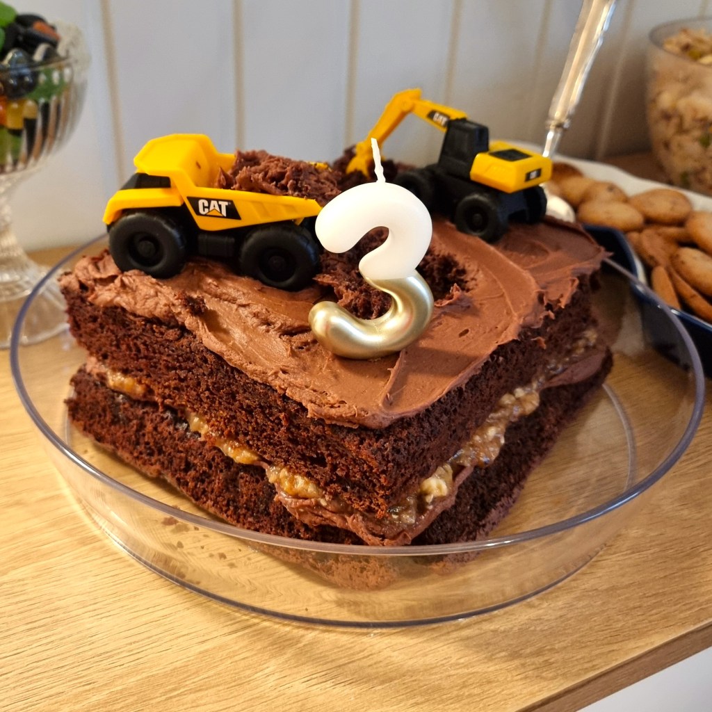 Kuvassa tämä kakkuversio, jonka tein meidän 3-vuotiaalle työkonefanille. Oli muuten helppoa ostaa vain valmiit työkoneet, jotka mini sai leikkeihin heti kun joutivat kakun päältä (ja saatiin tiskattua).